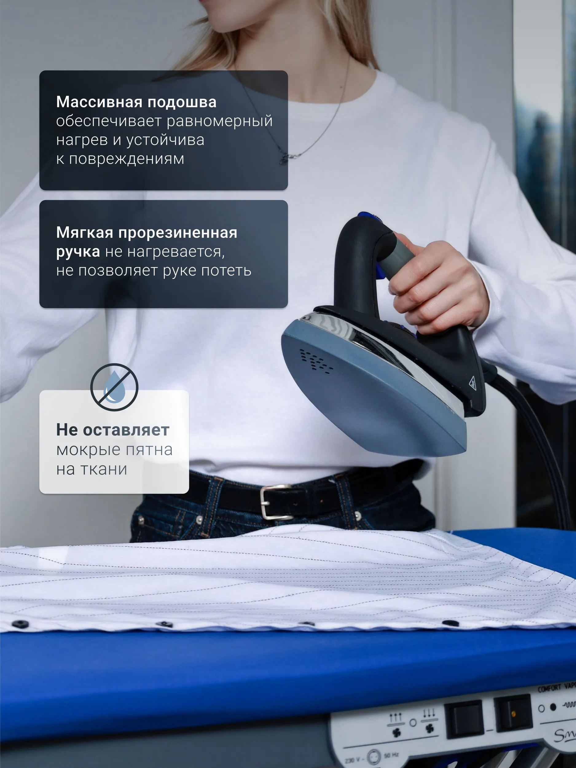 Позволяет сохранять температуру утюга очень долгое время. С помощью своей тяжести, теперь не нужно оказывать давление на утюг для лучшей разглажки.