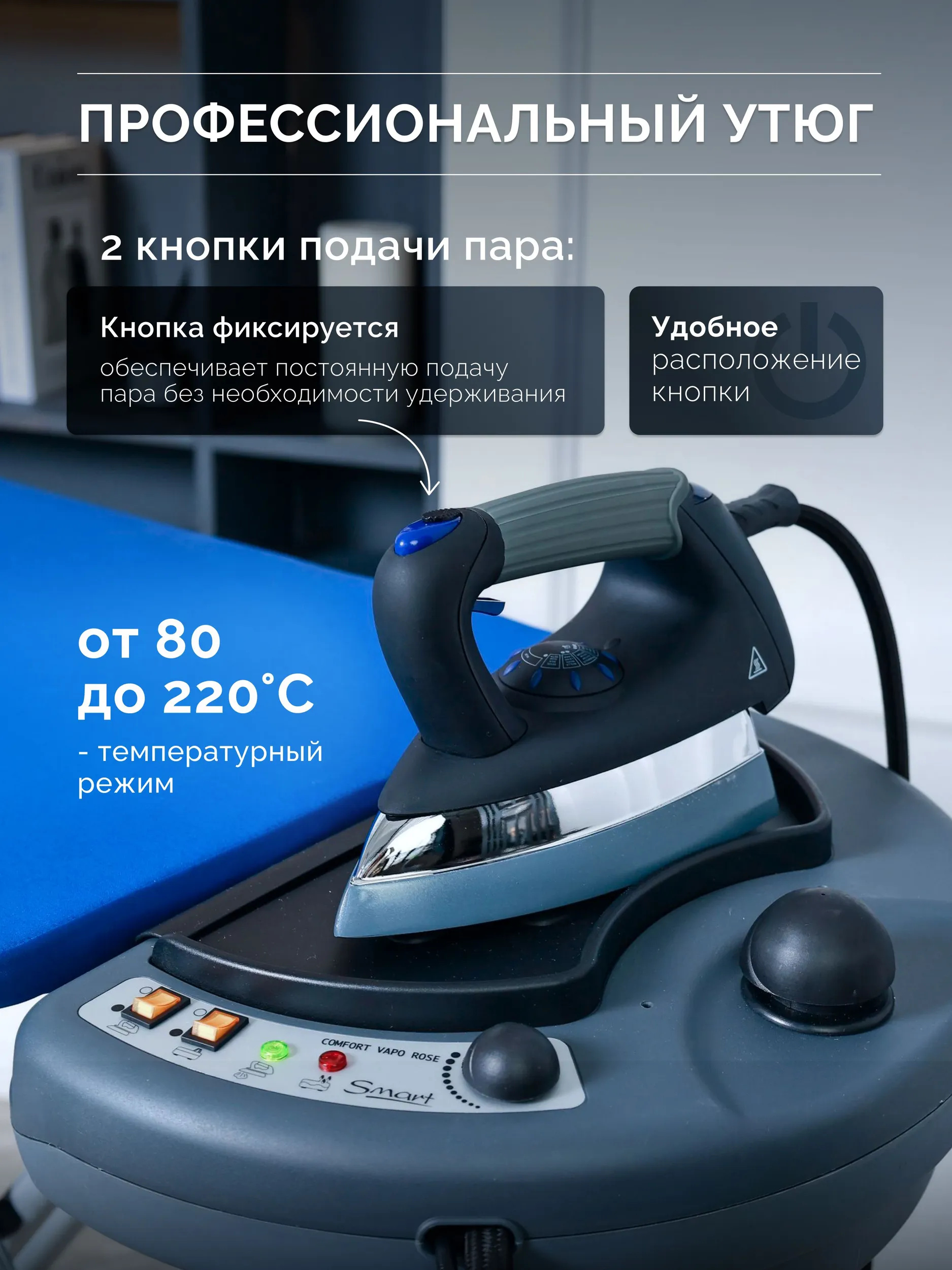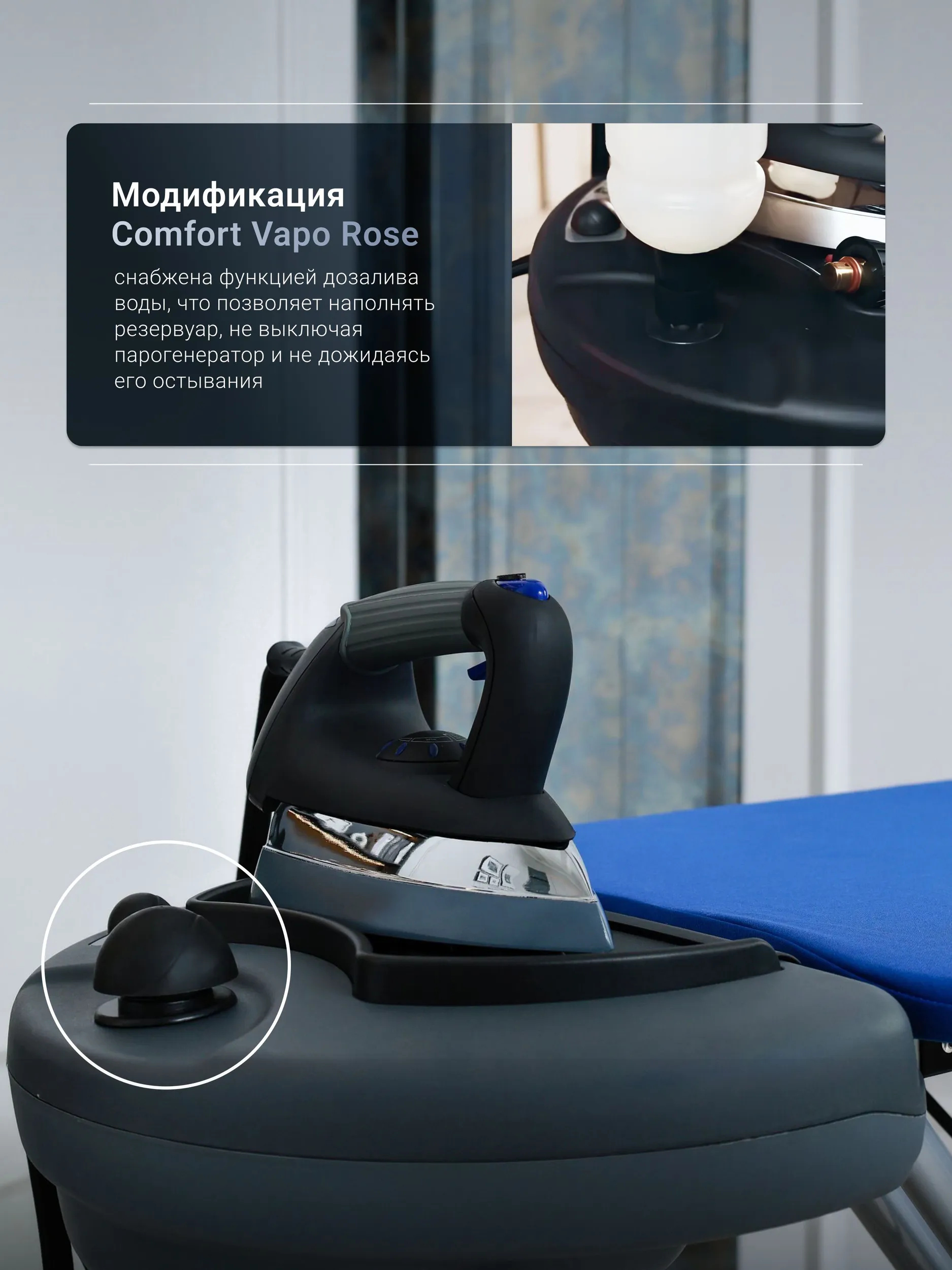 Побалуйте свой гардероб и себя гладильной системой Comfort Vapo Rose Luxe. Наслаждайтесь преимуществами профессиональной глажки у себя дома и ощутите безупречную гладкость своей одежды каждый день.