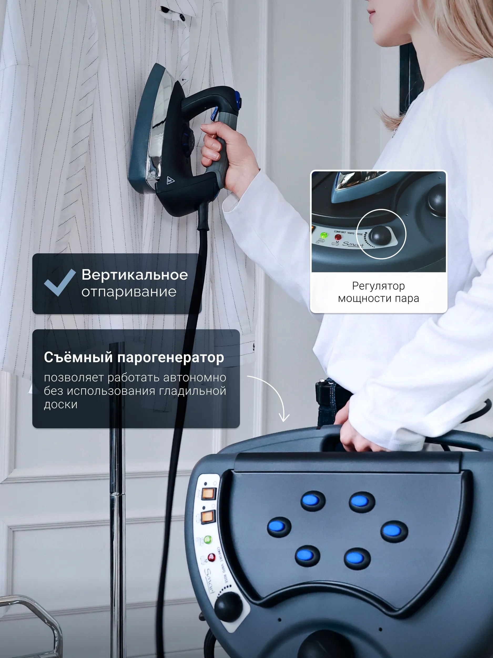 Мощный парогенератор и высокое давление обеспечивает возможность гладить вертикально с помощью парового утюга. Для перевода режима работы утюга из «сухого» пара до отпаривания достаточно просто немного уменьшить температуру нагрева утюга. С помощью вертикального отпаривание можно не только разгладить вещи на весу, но и удалить запахи.